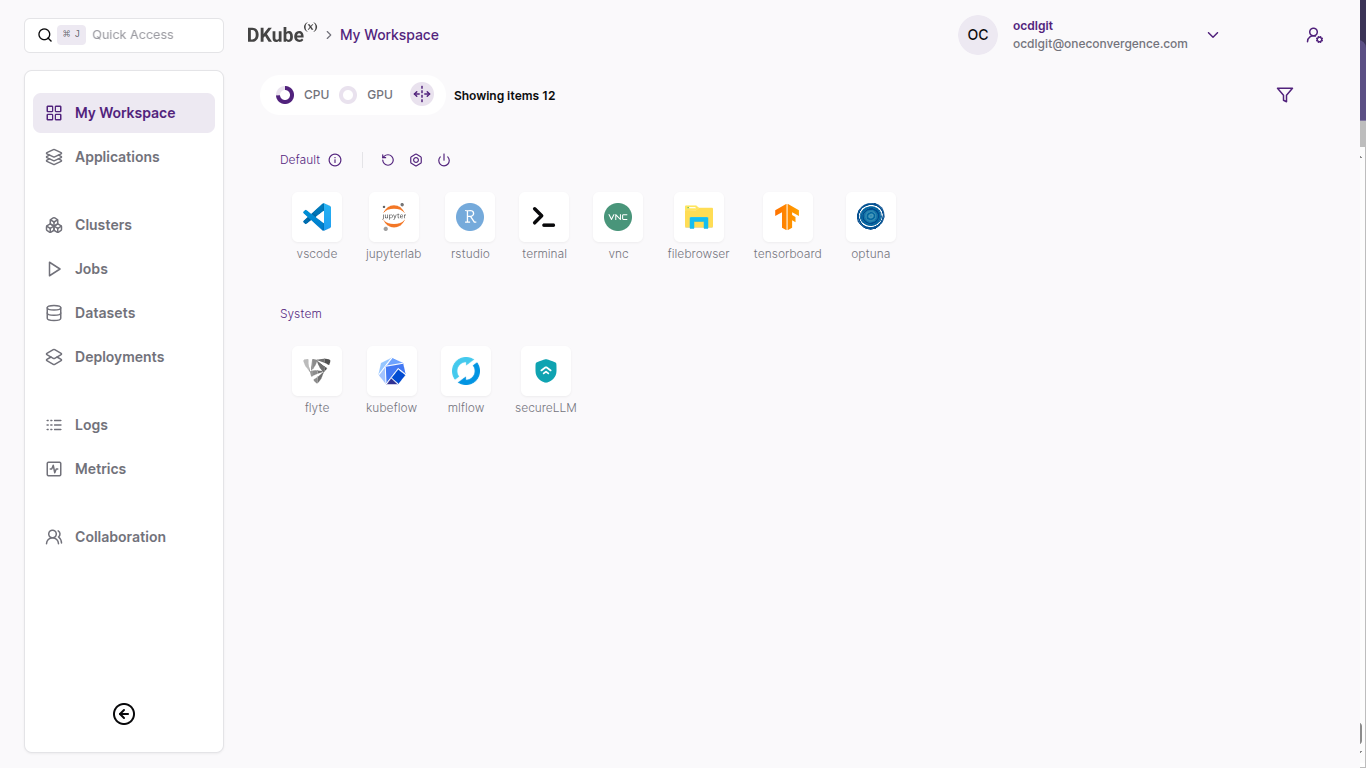 The DKubeX UI consists of multiple tabs, each of which have their own unique function in building, testing, deploying and serving models and applications.
