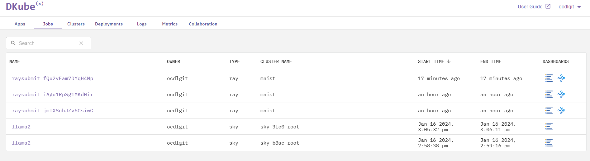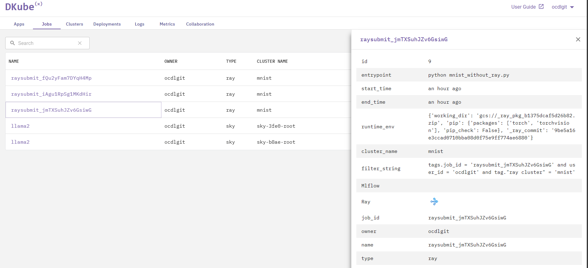 The Jobs tab shows the Ray jobs & Sky jobs that have been run on DKubeX, along with all relevant information regarding those jobs.