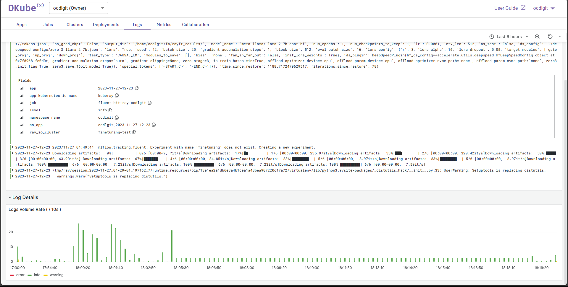 The Logs tab keeps detailed information about events in the workspace and any application that is integrated into the workspace. Application or workspace specific logs can be viewed by clicking on the app drop-down menu and selecting the required app(s). Also on the top-right corner of the tab you can select the time range for which you want to view the logs, and also the refresh rate for the logs tab.