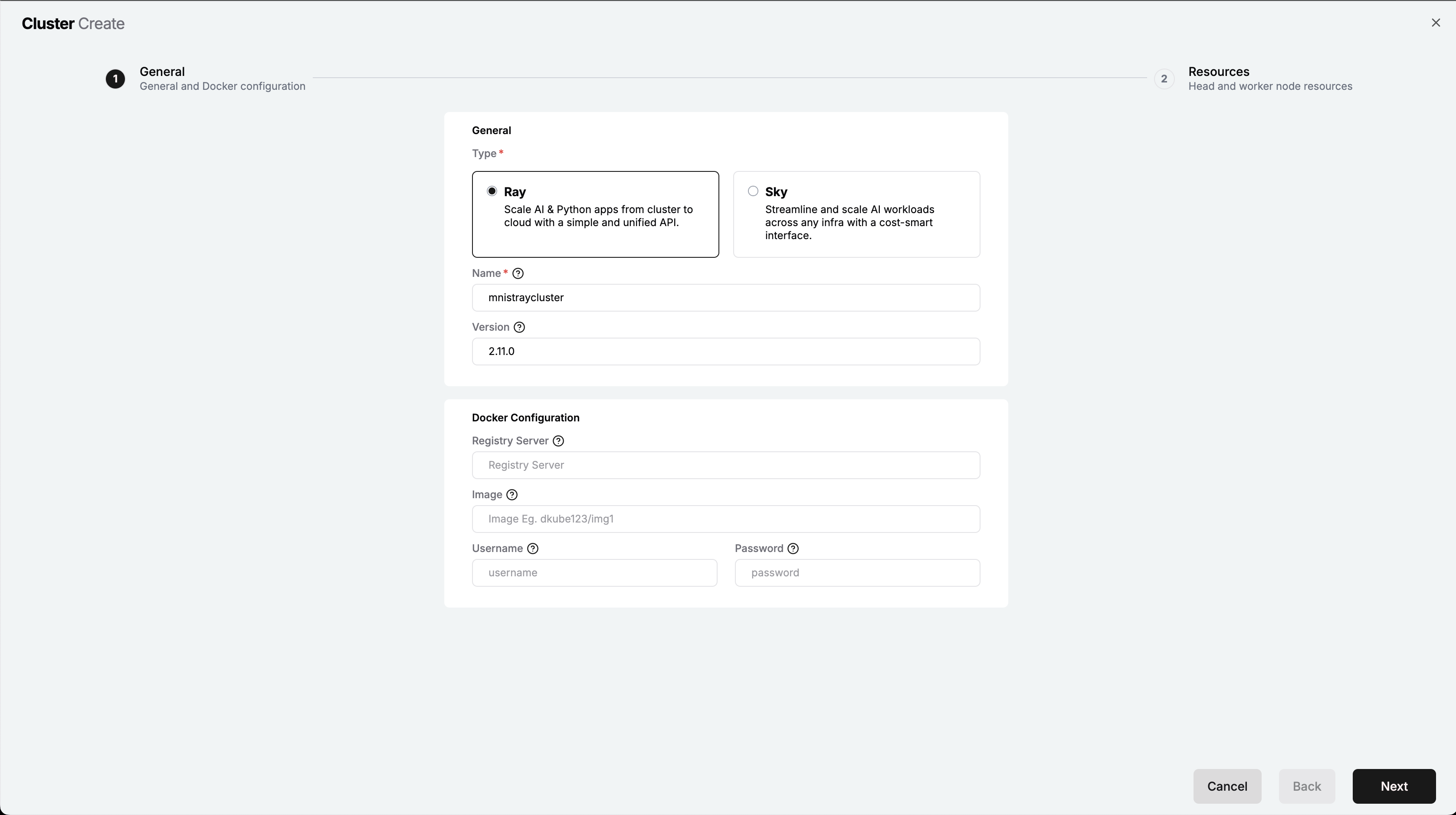 2.11.0Optionally, in the Docker Configuration section, you can provide a custom Docker image for the Ray cluster to be created. Provide the Docker registry server, the image tag, username and password for the custom Docker image.