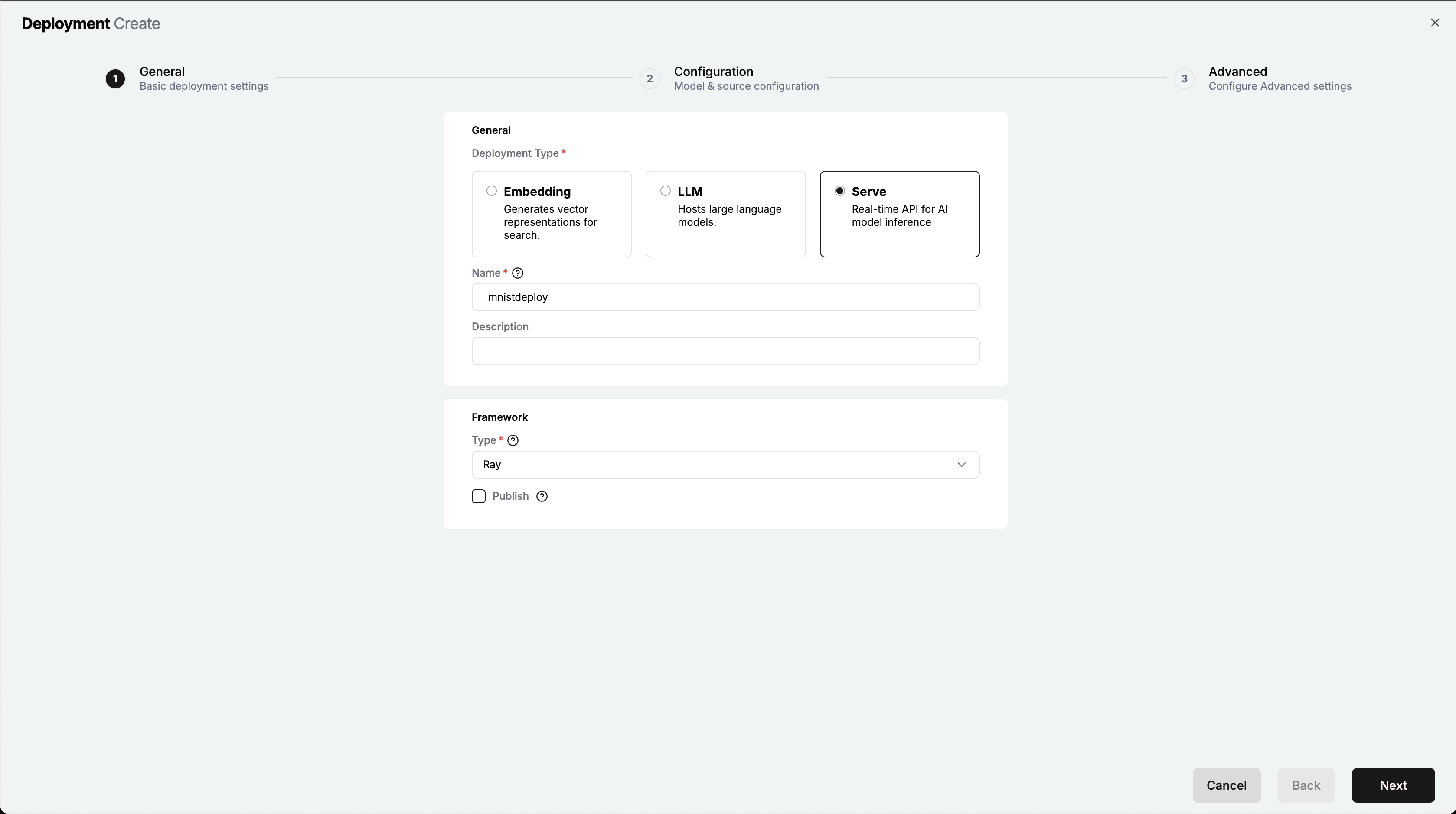 Rayas we are going to use Ray Serve for this model deployment. Optionally, you can also select the Publish checkbox to publish this deployment so that other users of the same DKubeX setup can also access and use this deployment.Once done, click on the Next button to proceed to the Configuration page.