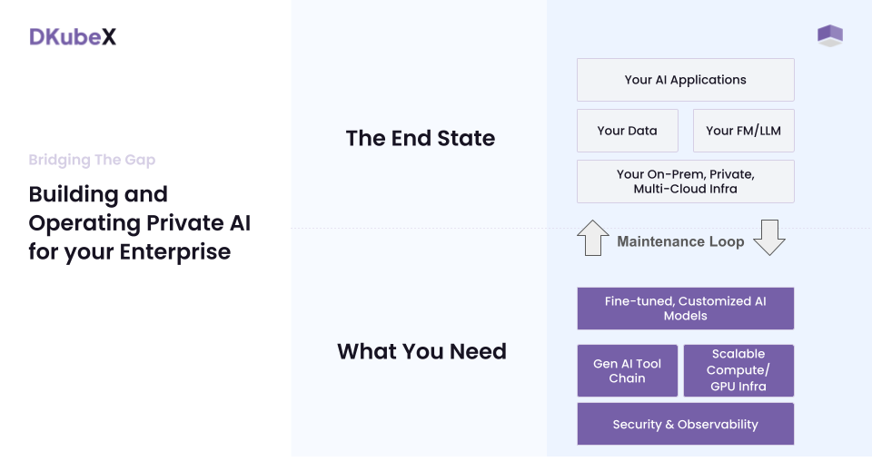 DKubeXTM is a Kubernetes-based AI platform for the secure, private deployment of Generative AI applications, optimizing resource allocation, ensuring compliance, and integrating with existing pipelines in on-premises and private cloud environments. It provides a scalable and efficient infrastructure for managing AI workloads in enterprise settings.