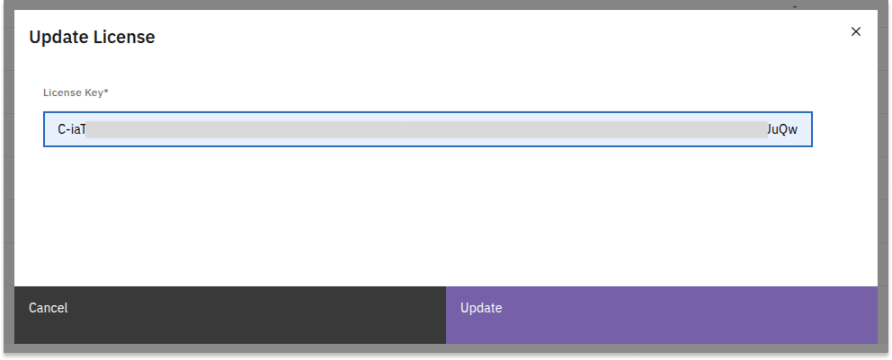 You can update the DKubeX license for the first time by clicking on the Update button on the top of the screen or going to the License tab and clicking on the License Update button. Once done, the DKubeX license update dialog box will appear.