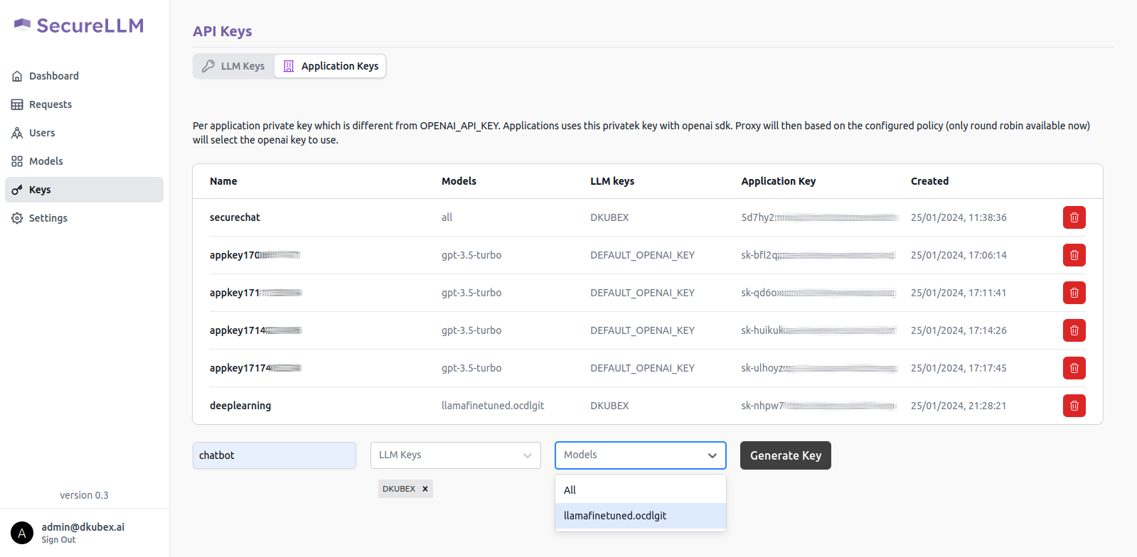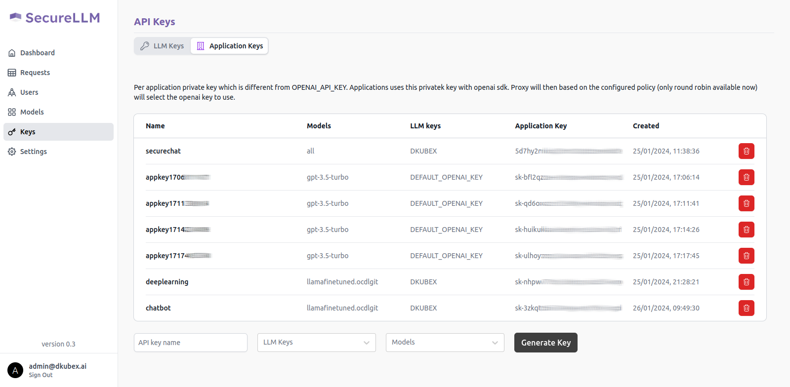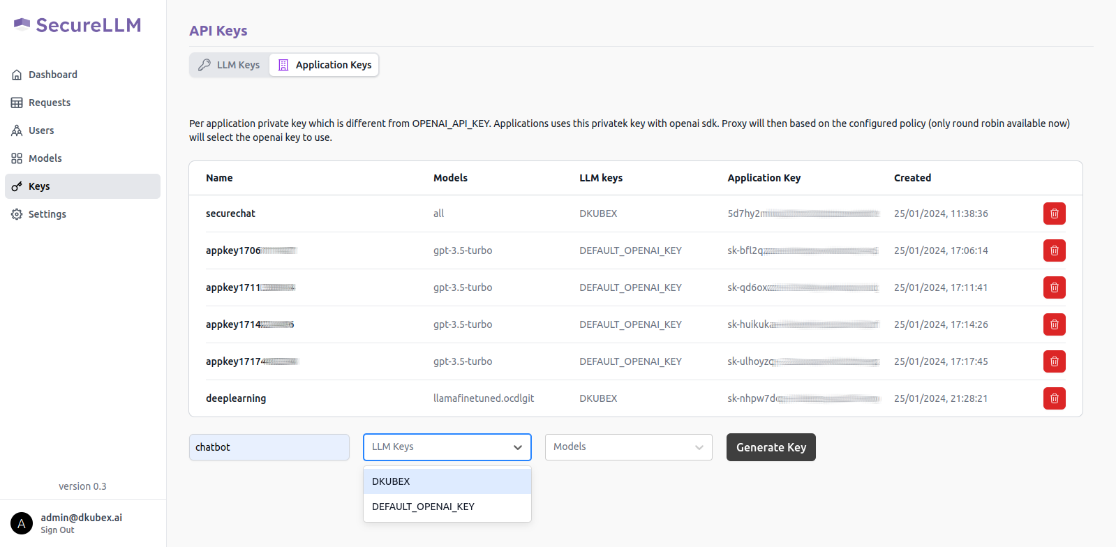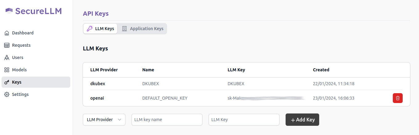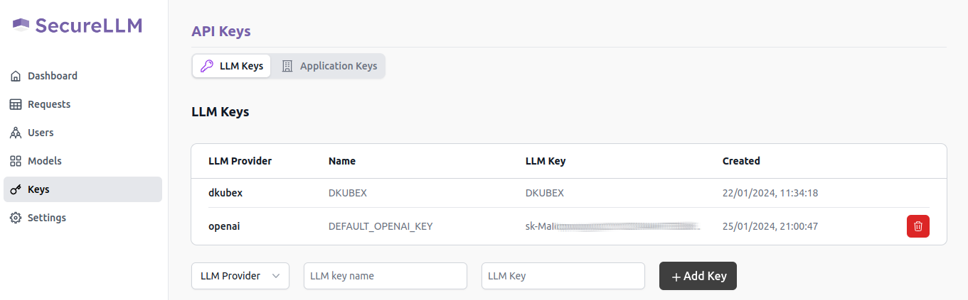 The Keys page contains details regarding all API keys (LLM keys and SecureLLM application keys), along with the option to add, create and delete new API keys. For more information regarding this, please visit Using SecureLLM.