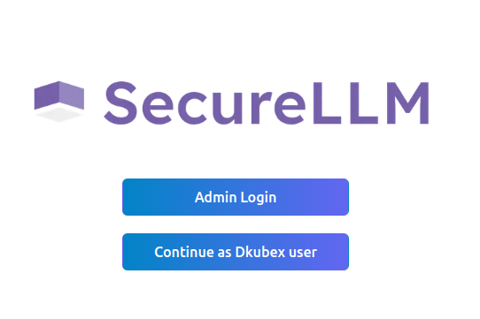 The SecureLLM Login screen will open with two options: Admin Login and Continue as DKubeX User.
