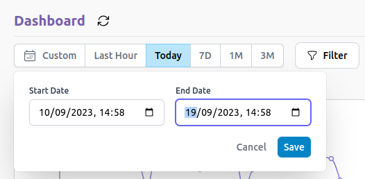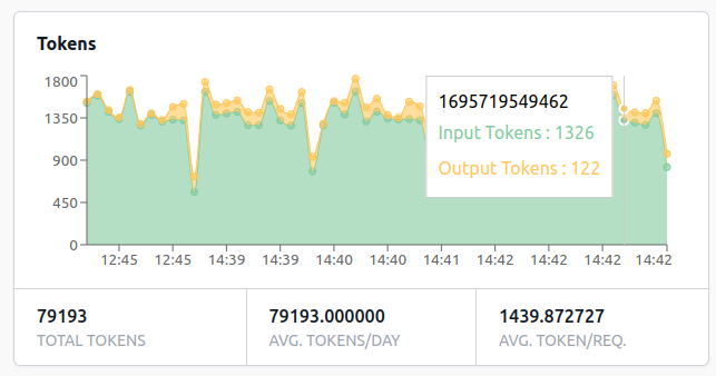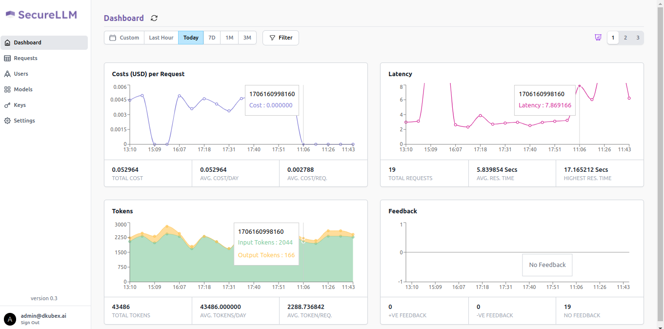 SecureLLM Dashboard provides graphical representation of data regarding all LLM requests processed via SecureLLM during a specific time range.