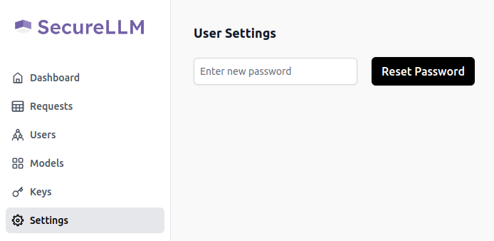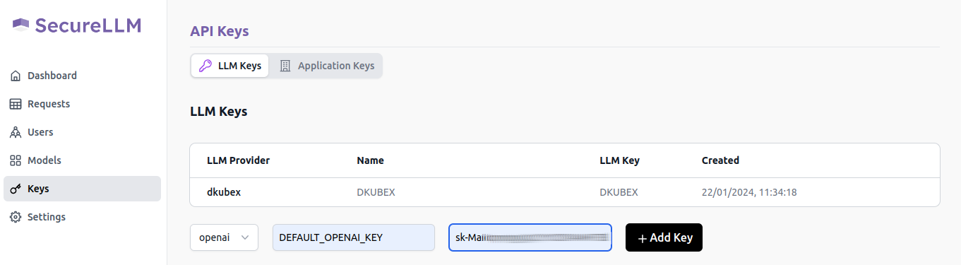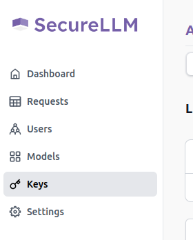 Open SecureLLM UI and click on Keys on the left sidebar.