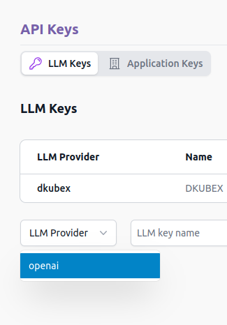 From the LLM Keys dropdown list, select the LLM key from the LLM Keys list you are going to use with this application key.