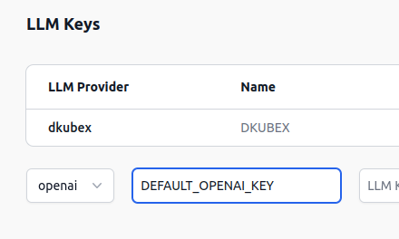 If you are going to use models deployed in DKubeX, use the DKUBEX key. Otherwise, use the key of the LLM provider you are going to use.