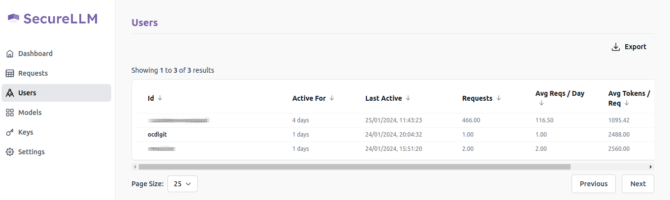 Clicking on the Users option on the left sidebar opens the Users page, which contains details of the users that have used SecureLLM and data regarding their usage.