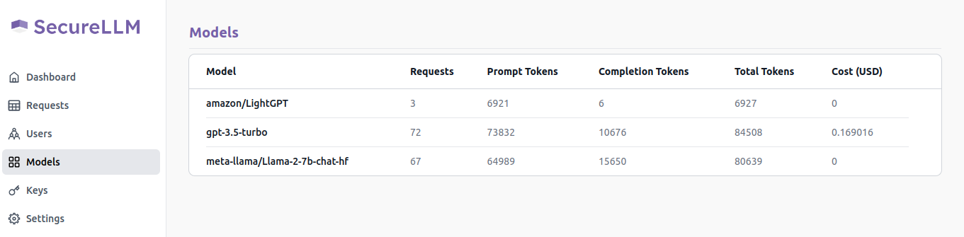 The Models page contains details of all the LLM models that have been used for all the requests that SecureLLM has recorded.