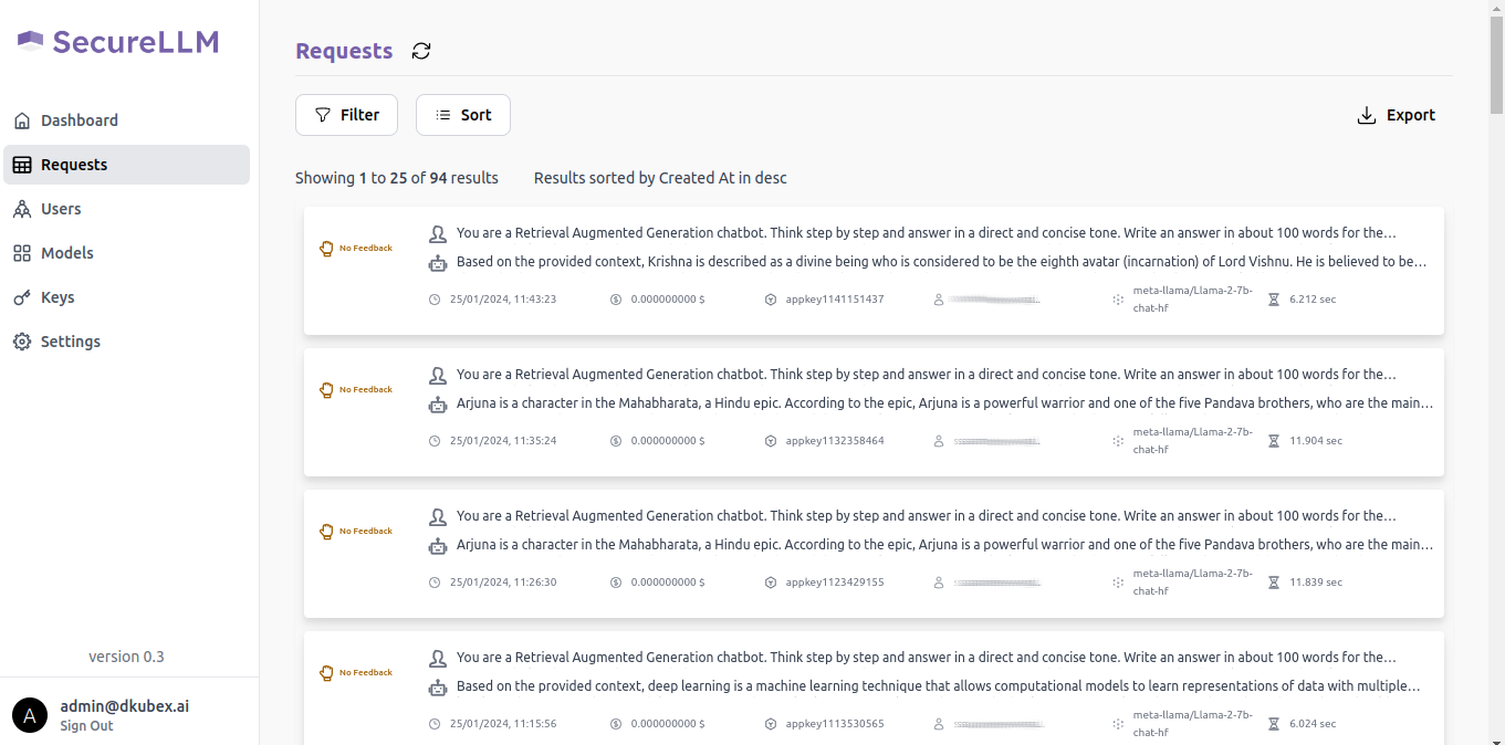 All the requests by all users across all the applications which are onboarded to SecureLLM are recorded. Data regarding all these requests can be monitored by requests, by users or by models.