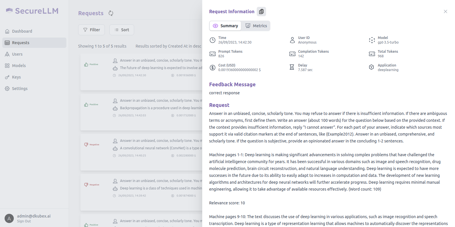 For details regarding this section, please visit Monitoring User Requests on SecureLLM.