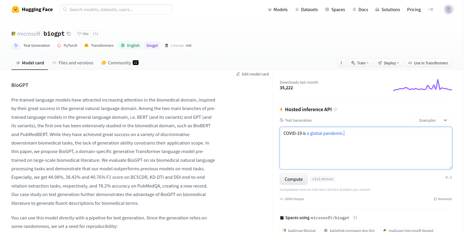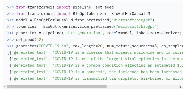 • In the model description, from the sample code provided, you can find the tokenizer for the model. For this example in the next photo, the tokenizer is BioGptTokenizer. Make a note of it.