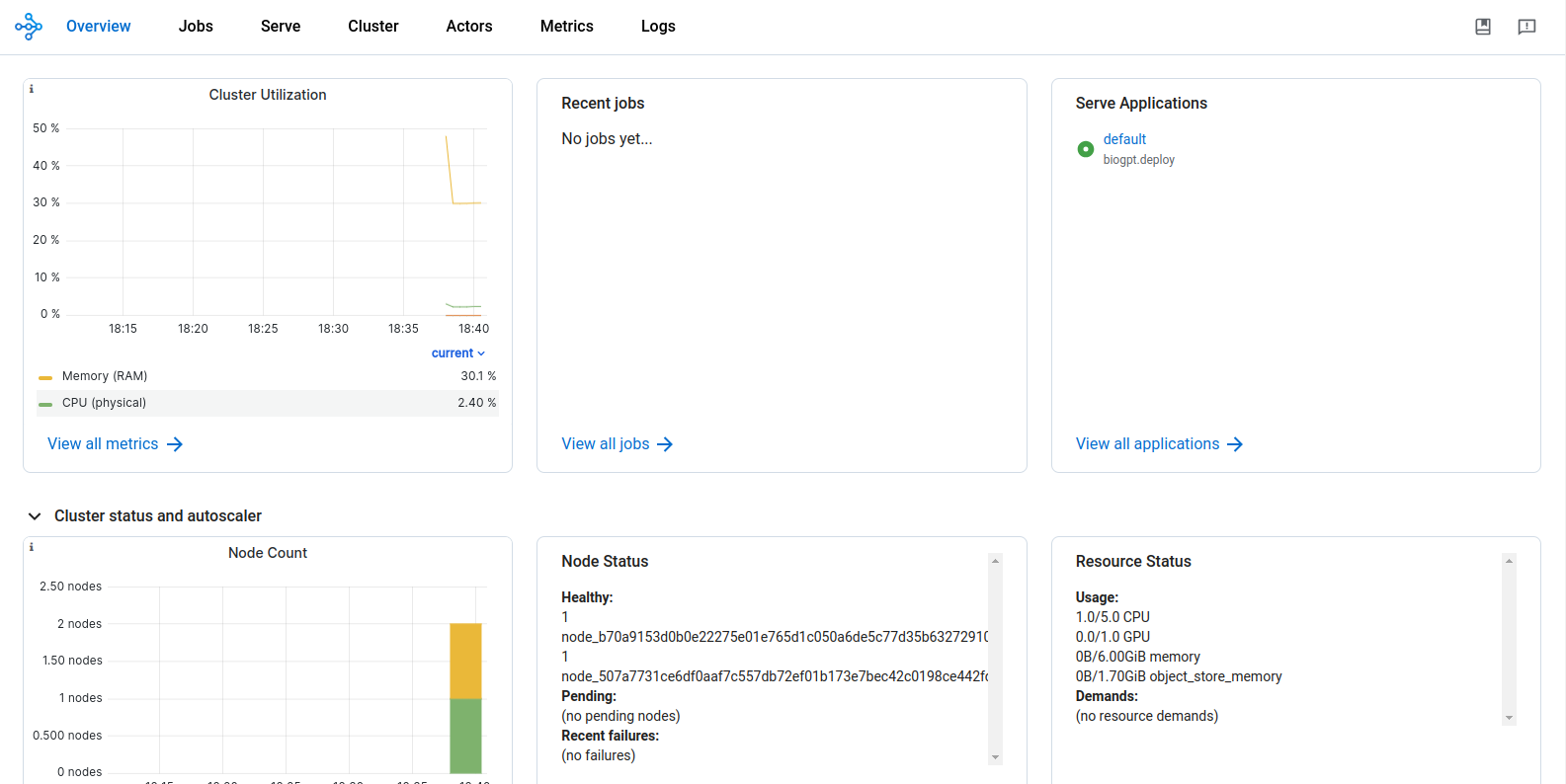 • Clicking on the name of the serve cluster opens the Ray dashboard for that cluster.