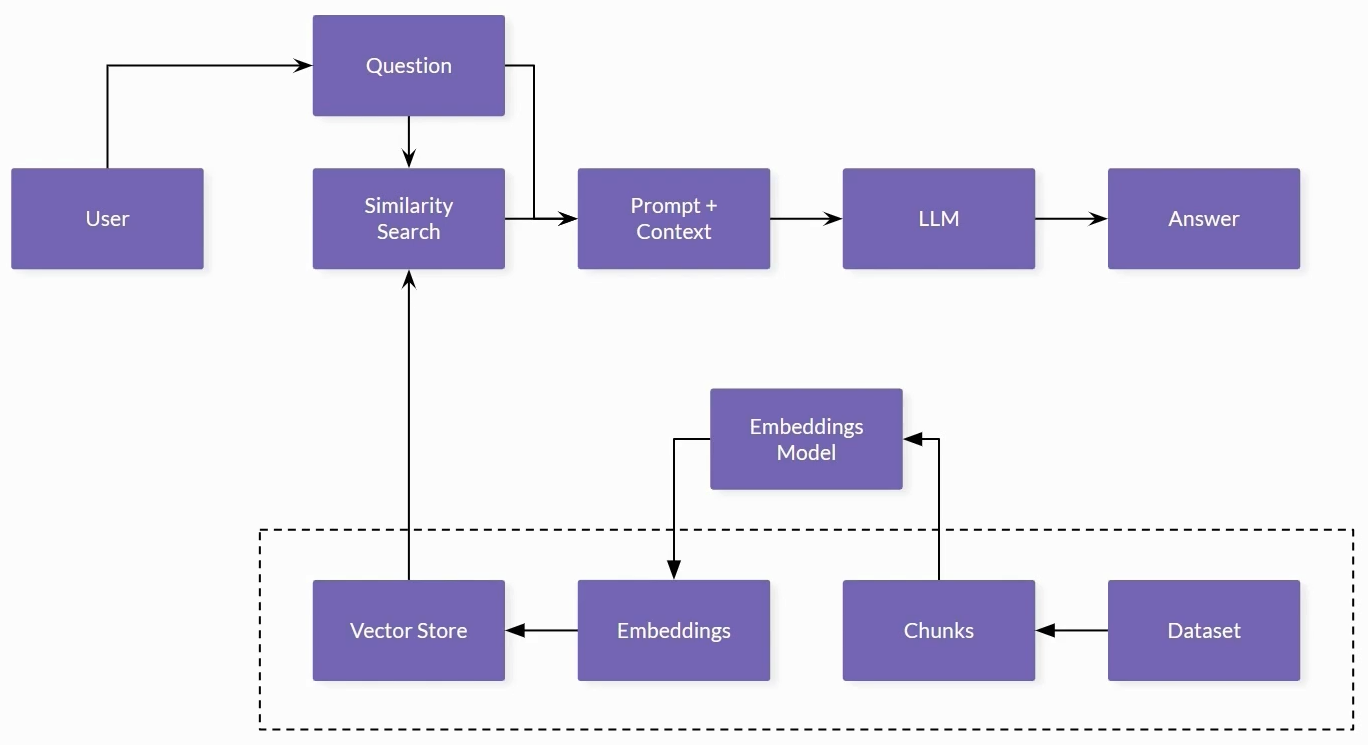 In this workflow, datasets (PDF, DOCX, TXT, HTML) are first divided into smaller segments or chunks. These chunks are then transformed into embeddings using an embeddings module and then stored in a vector database for efficient retrieval.